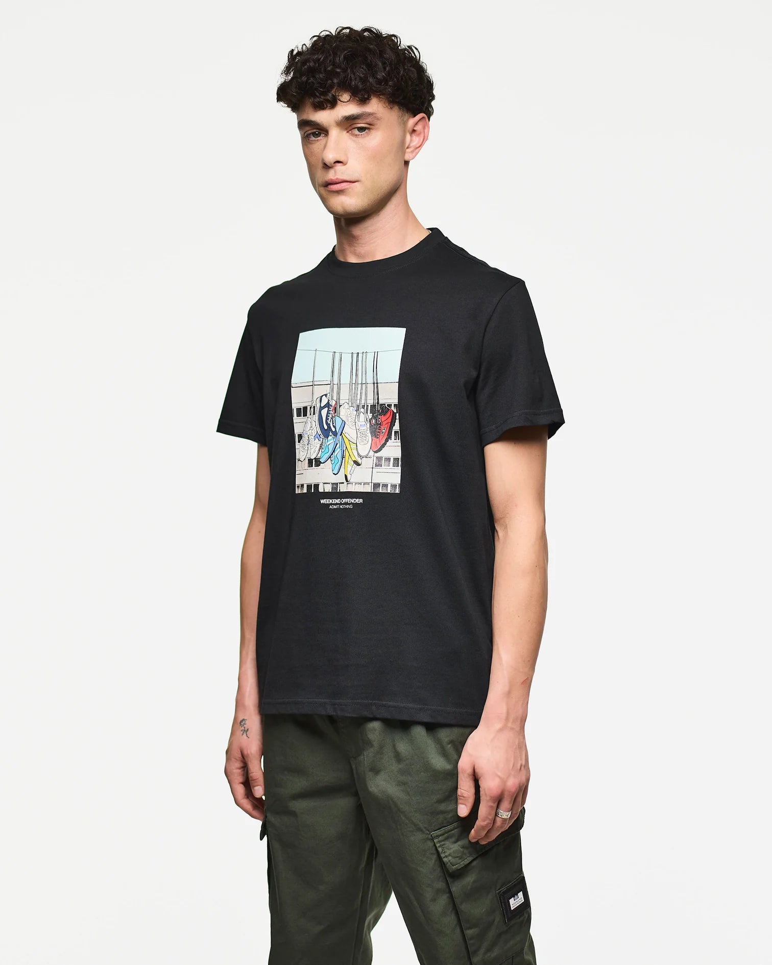 Le scarpe appese ai cavi elettrici sono un'icona della cultura urbana globale, con significati che variano da quartiere a quartiere: marcatori territoriali, memoriali, simboli di passaggio. Weekend Offender cattura questo linguaggio visivo delle strade britanniche, trasformandolo in una grafica statement che racconta storie di comunità, identità e appartenenza.